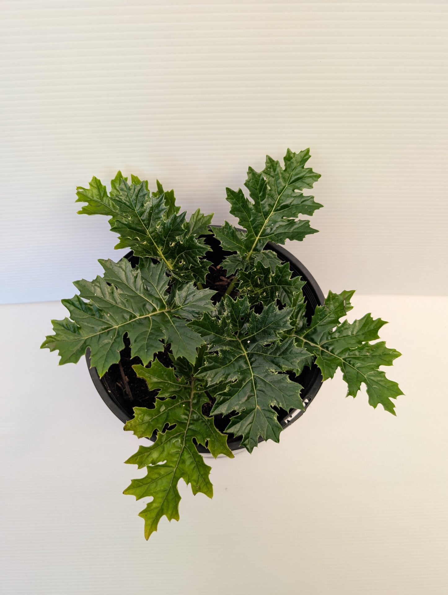 FOLIAGE: Deeply lobed, stiff and spikey, green with white variegation