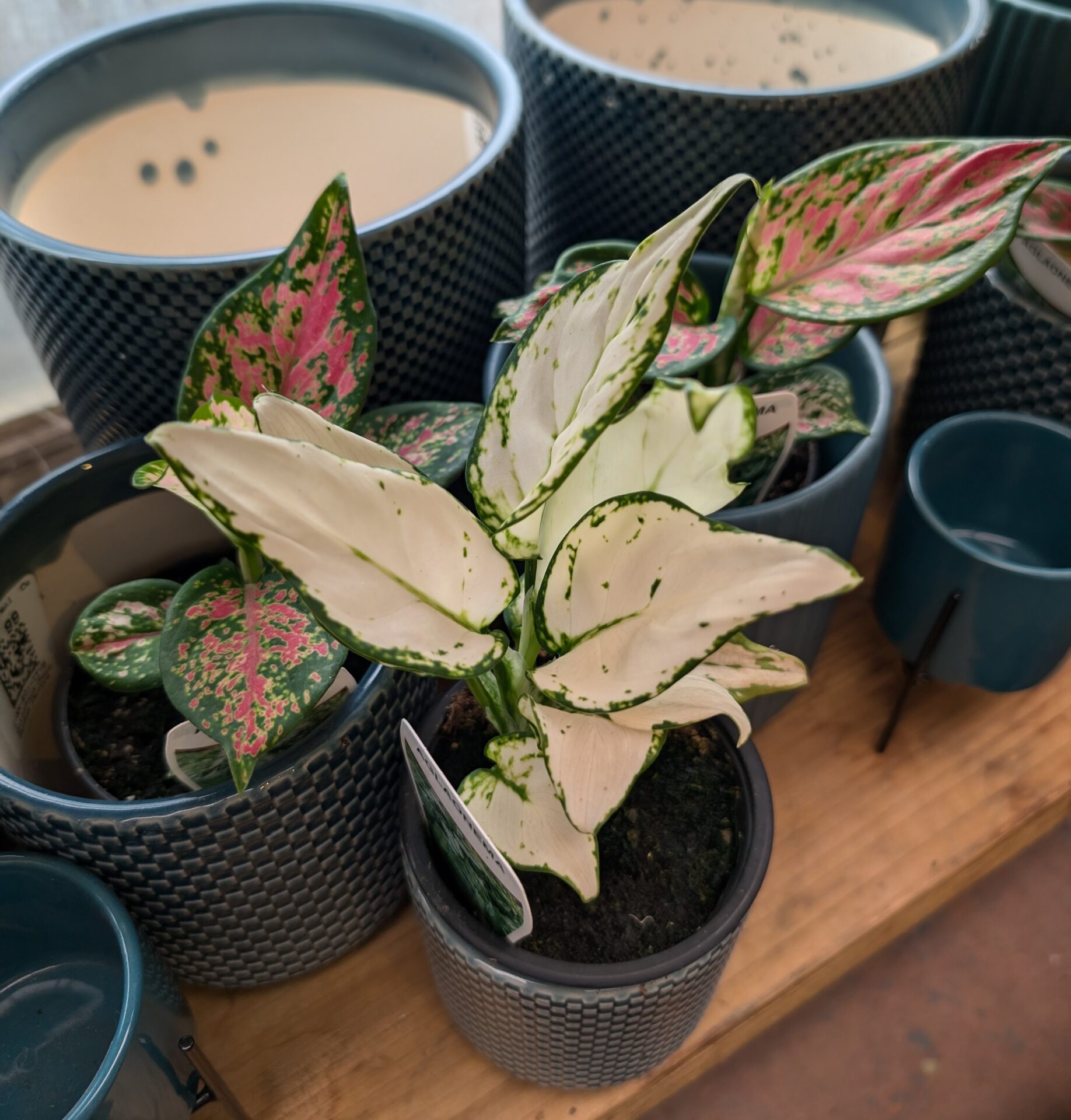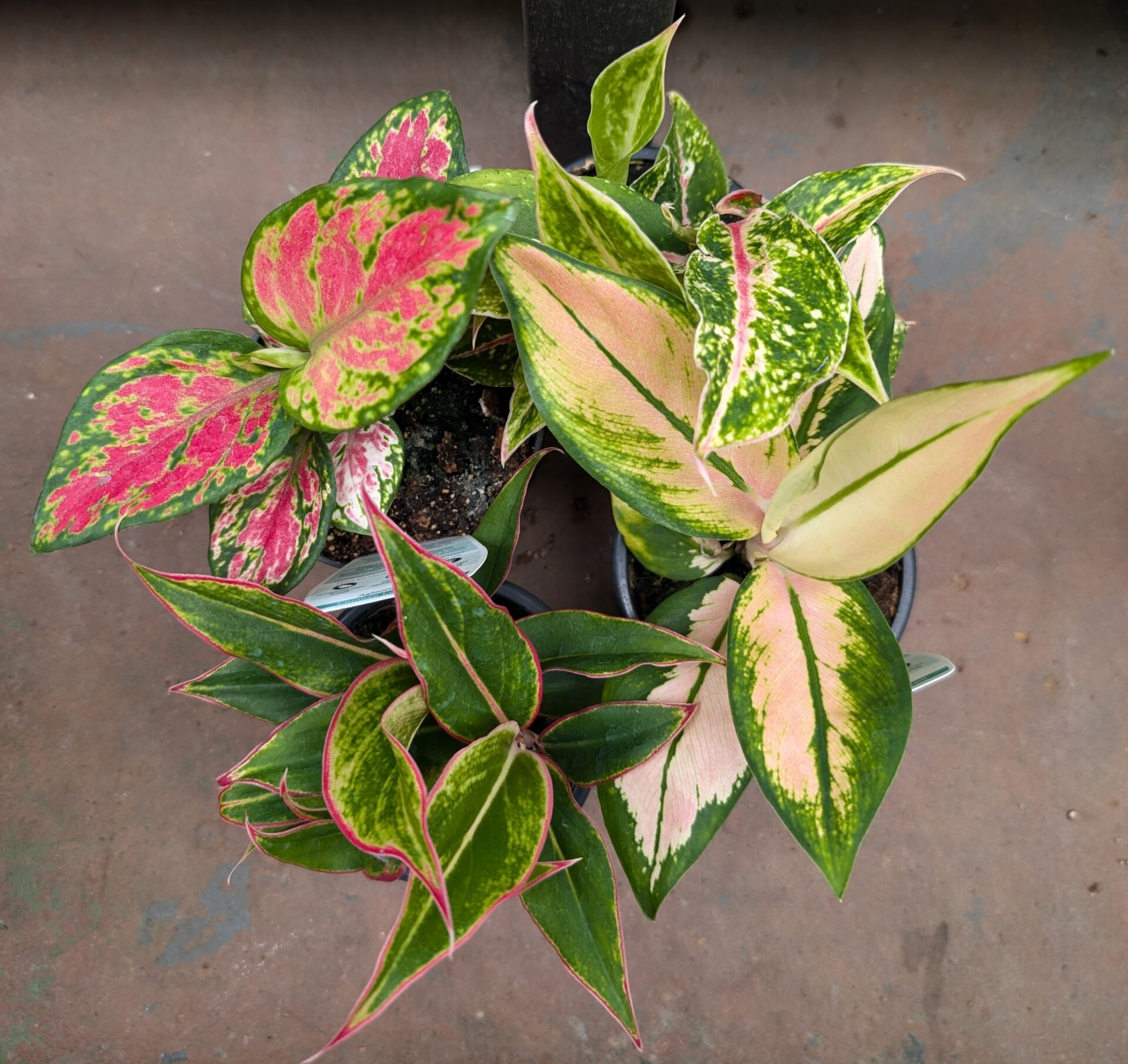FOLIAGE: Pointed, varied patterns, pink, green, cream and red