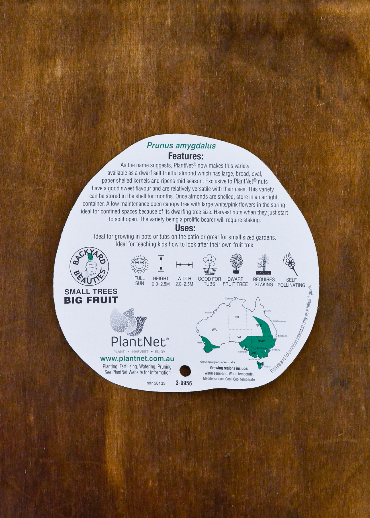 Dwarf self fertile almond that produces large, paper shelled nuts. The nuts ripen mid season, (early March) and have a good sweet flavour. Can be stored in shell for months. Nuts should be harvested as shell starts to split open. Suitable for growing in a large pot. Plant in full sun.