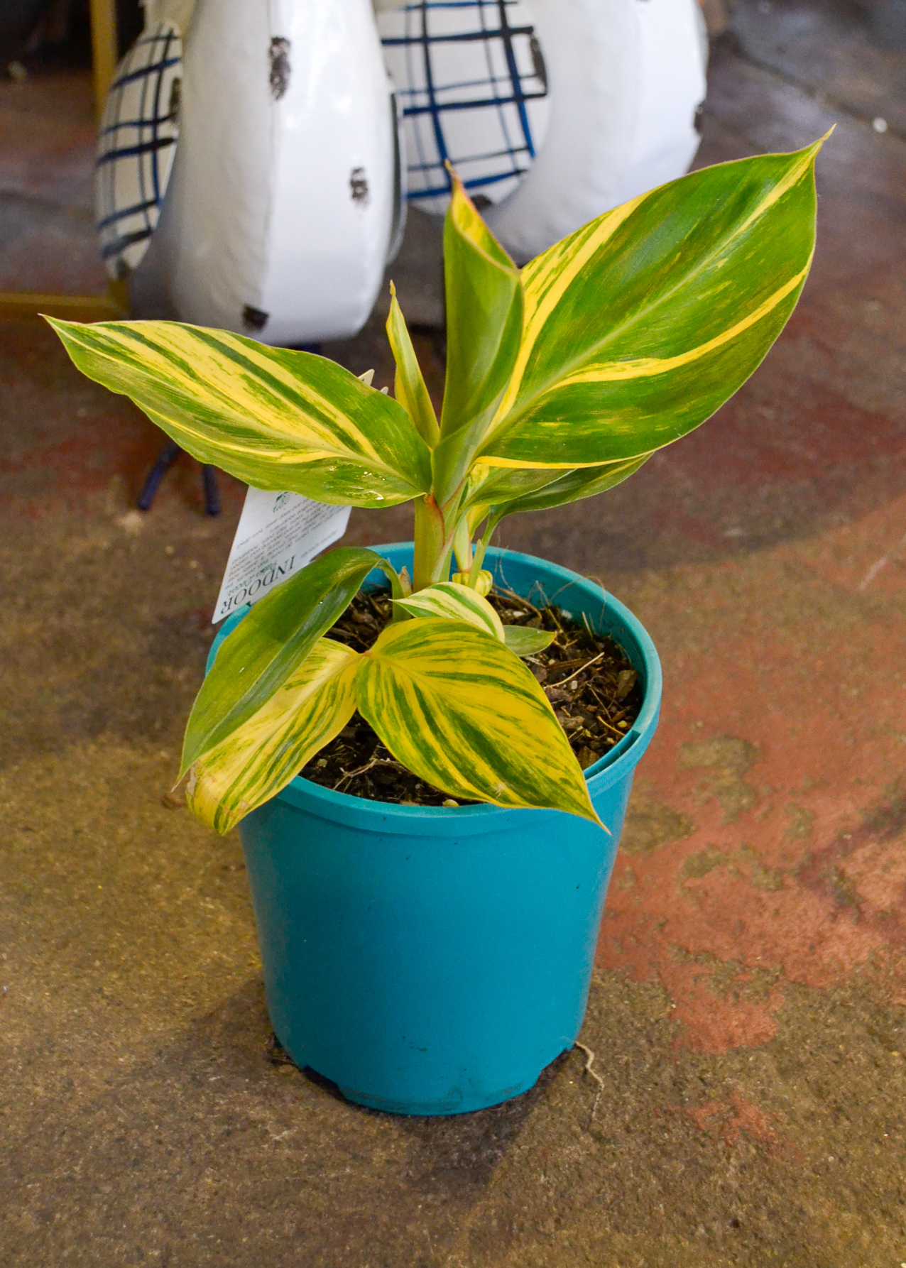 An ornamental ginger, this variegated variety will brighten a corner, with its bright canary-yellow stripes.