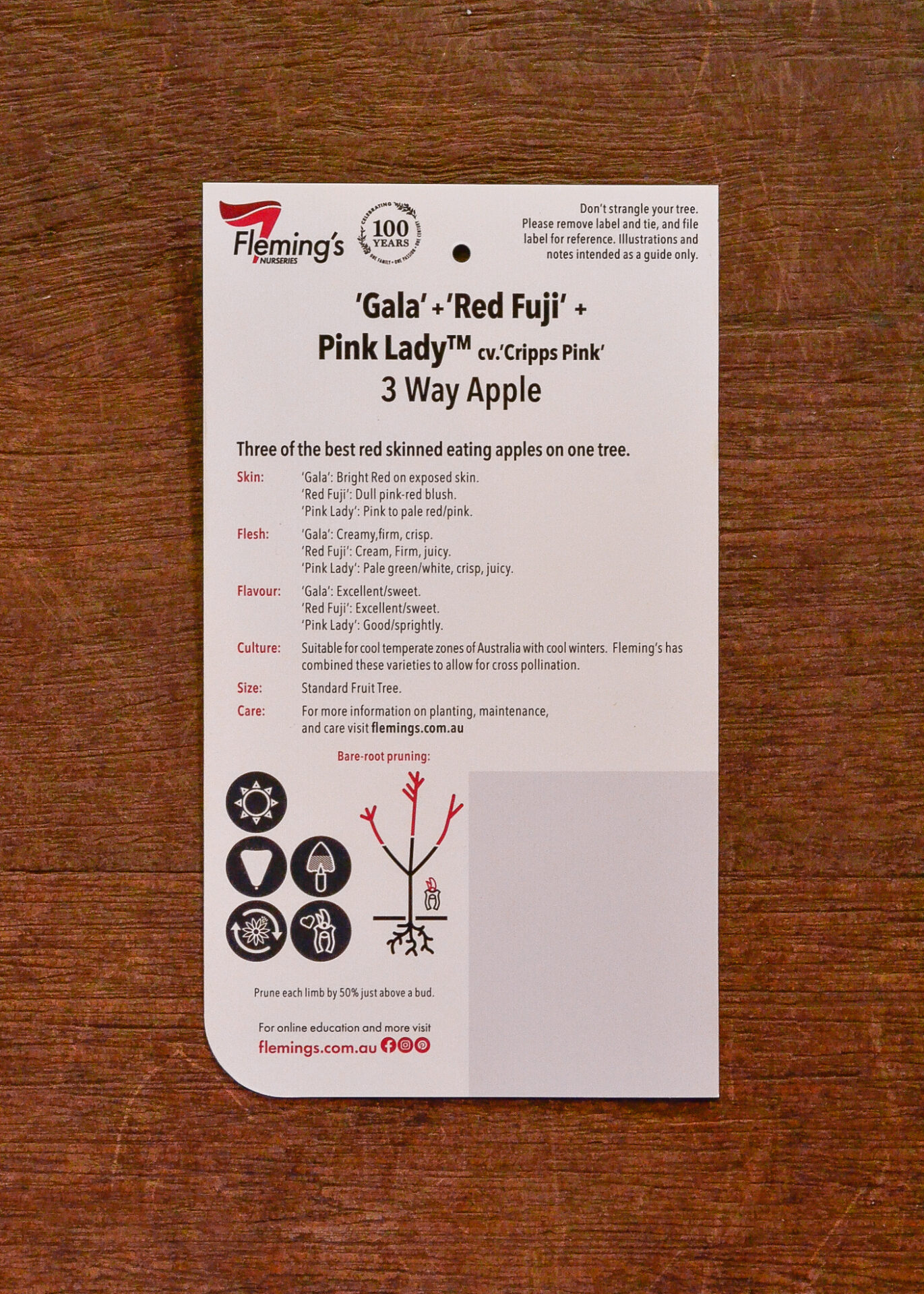 Multi-graft combination of ‘Gala’,’Pink Lady’, and ‘Red Fuji’. These three apples cross-pollinate each other. The three varieties will have a staggered fruiting period from early summer to early autumn with ‘Gala’ fruiting early season, ‘Red Fuji’ mid-season and ‘Pink Lady’ fruiting mid to late season.ย