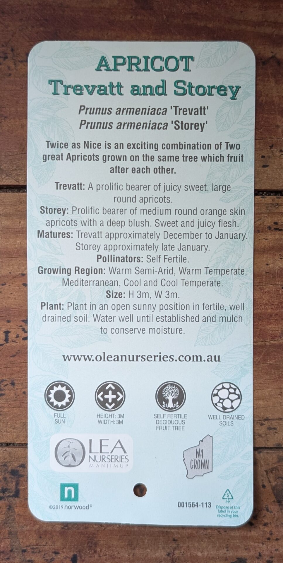 A multi-graft of two popular apricot varieties ‘Trevatt’ and ‘Storey’. Used for fresh fruit, drying, preserving, stewing, juice, and jams. The fruit ripens mid to late season over summer. ‘Trevatt’ ripens from December to January and ‘Storey’ around late January.