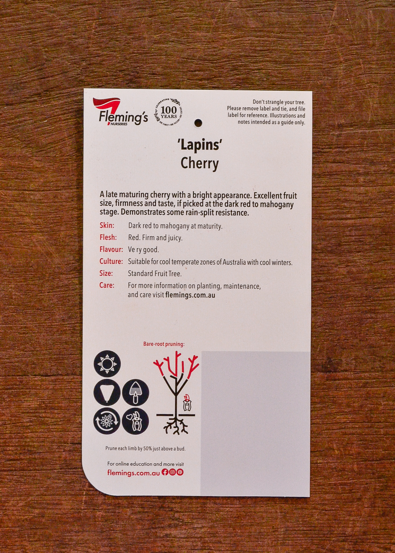 A late maturing cherry, used for fresh fruit, jams and preserves. Cherries require high chill hours to produce flowers and fruit. Please refer to staff for suitability in your area.