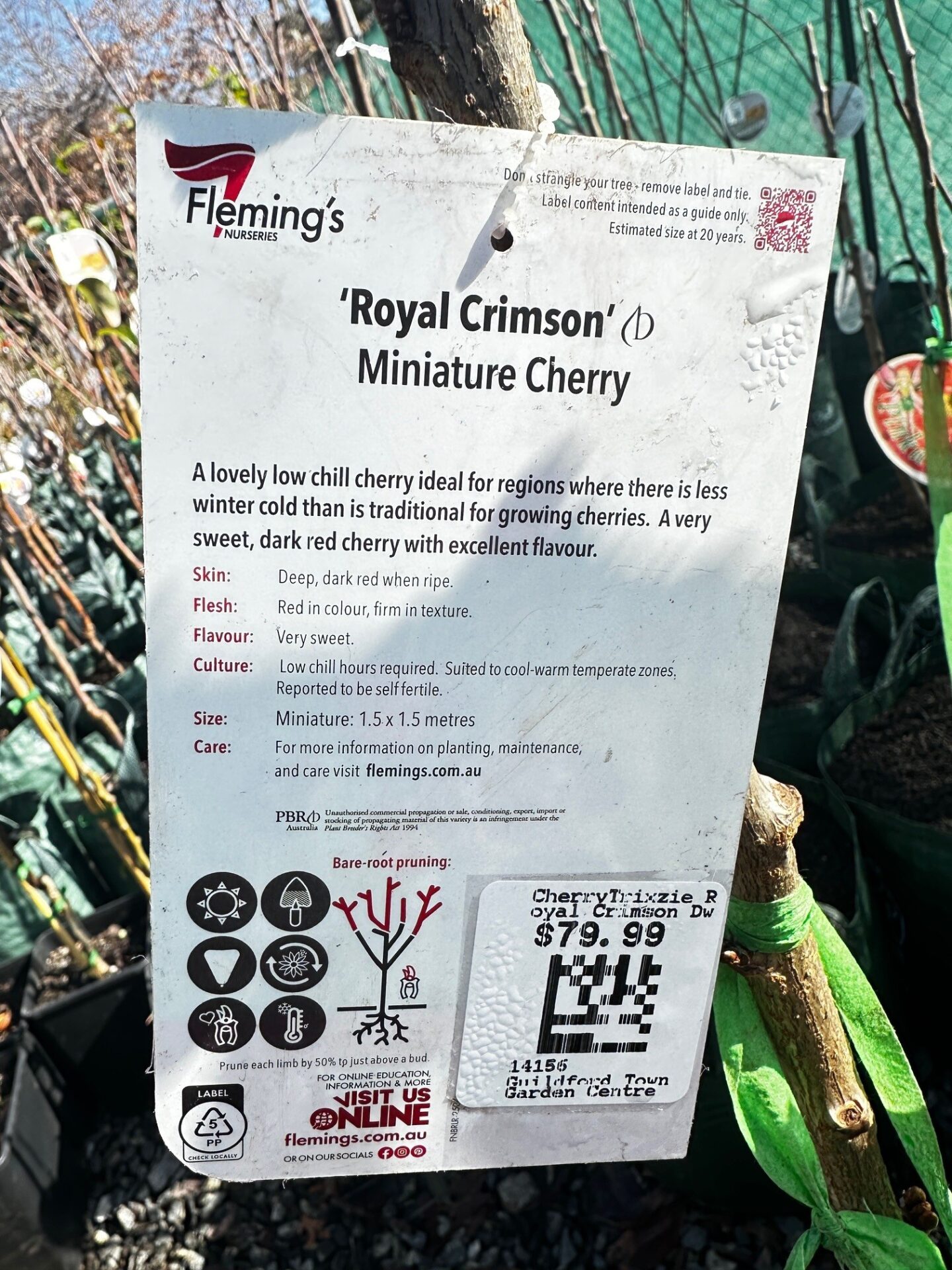 A new low-chill sweet cherry grafted variety, requiring only 200-400 chill hours to fruit. Excellent for pots and smaller gardens.