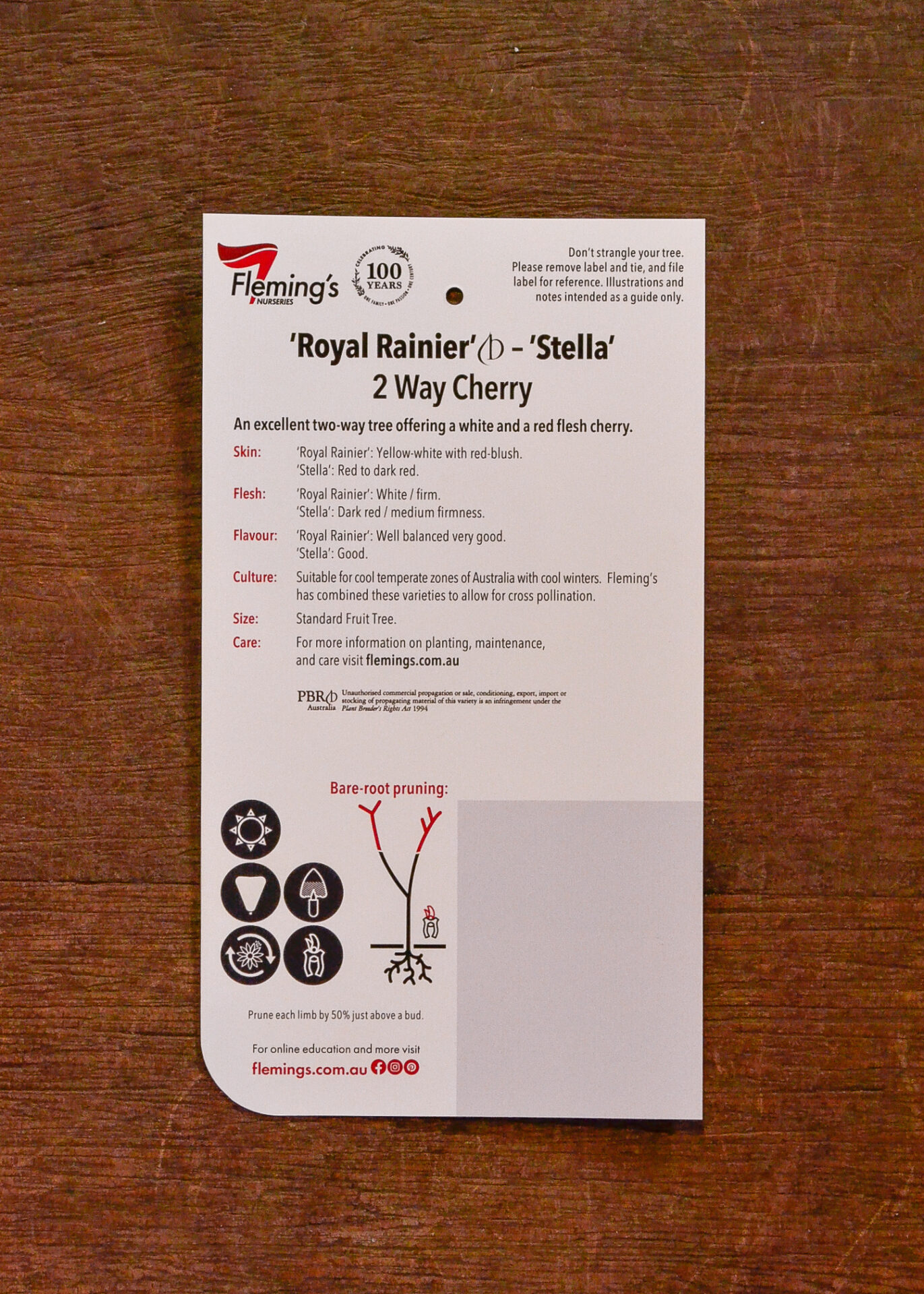 Two popular cherry varieties grafted onto the same tree. Cherries require high chill hours to produce flowers and fruit. Please refer to staff for suitability in your area.
