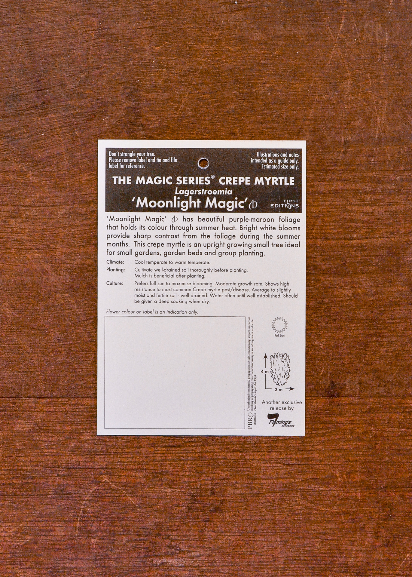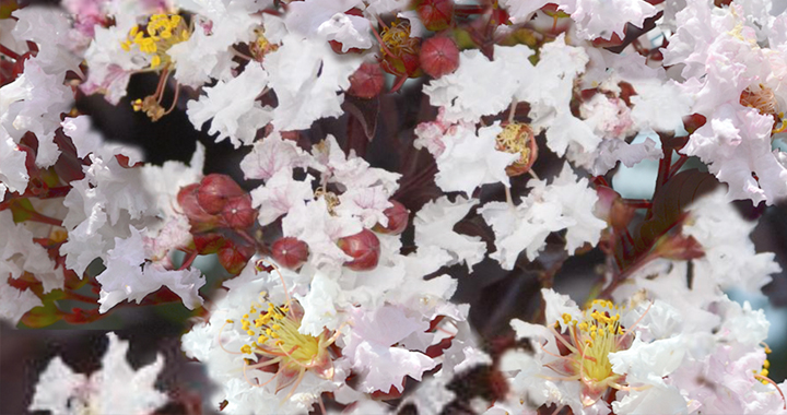 Dark maroon foliage contrasts with bright white summer blossoms. Lovely feature tree for a small garden, with a slender, upright growth habit. Excellent for growing in a pot. Resistant to leaf spot and powdery mildew.