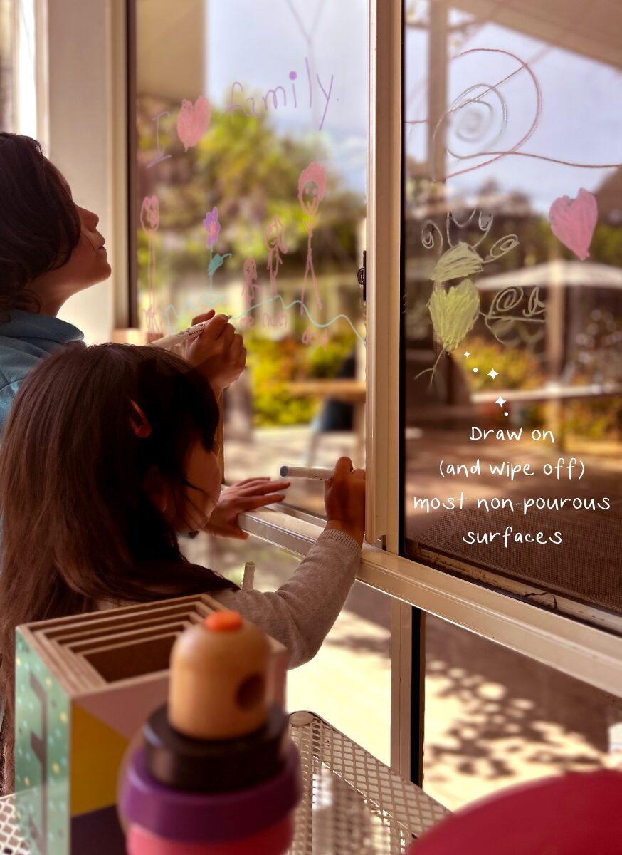 These markers are a parent’s delight as they are non-toxic, easily come off skin, wipe off most non-porous surfaces (including windows & mirrors).