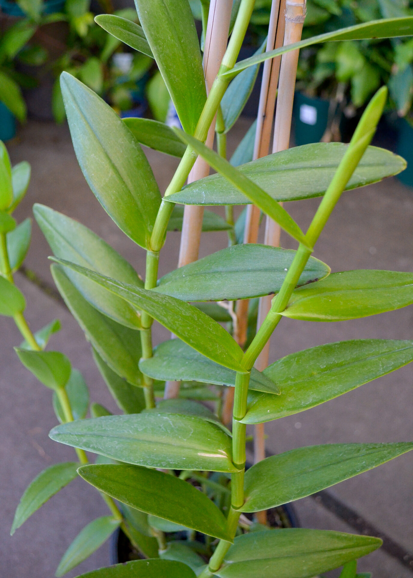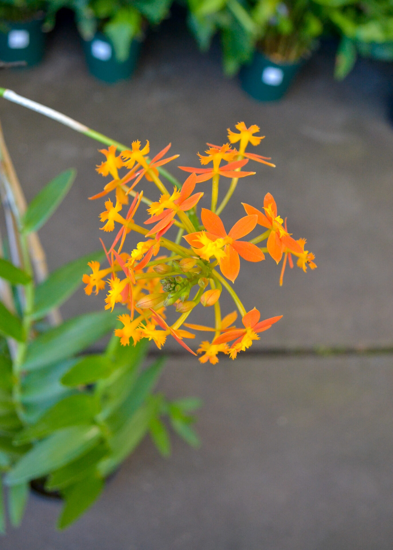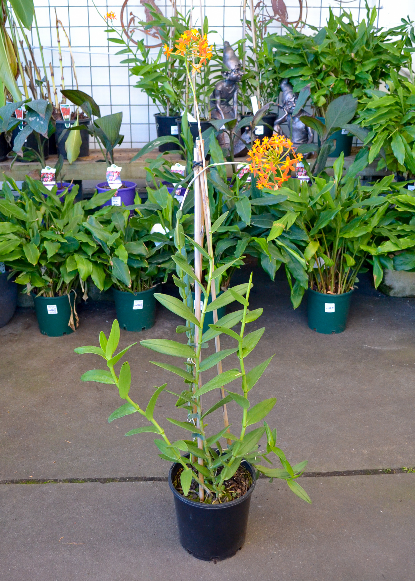 An easy care orchid with long, slender stems, and thick, leathery leaves that grow alternatingly up the stem. Bright orange flower heads are borne on long stems, and are long lasting.