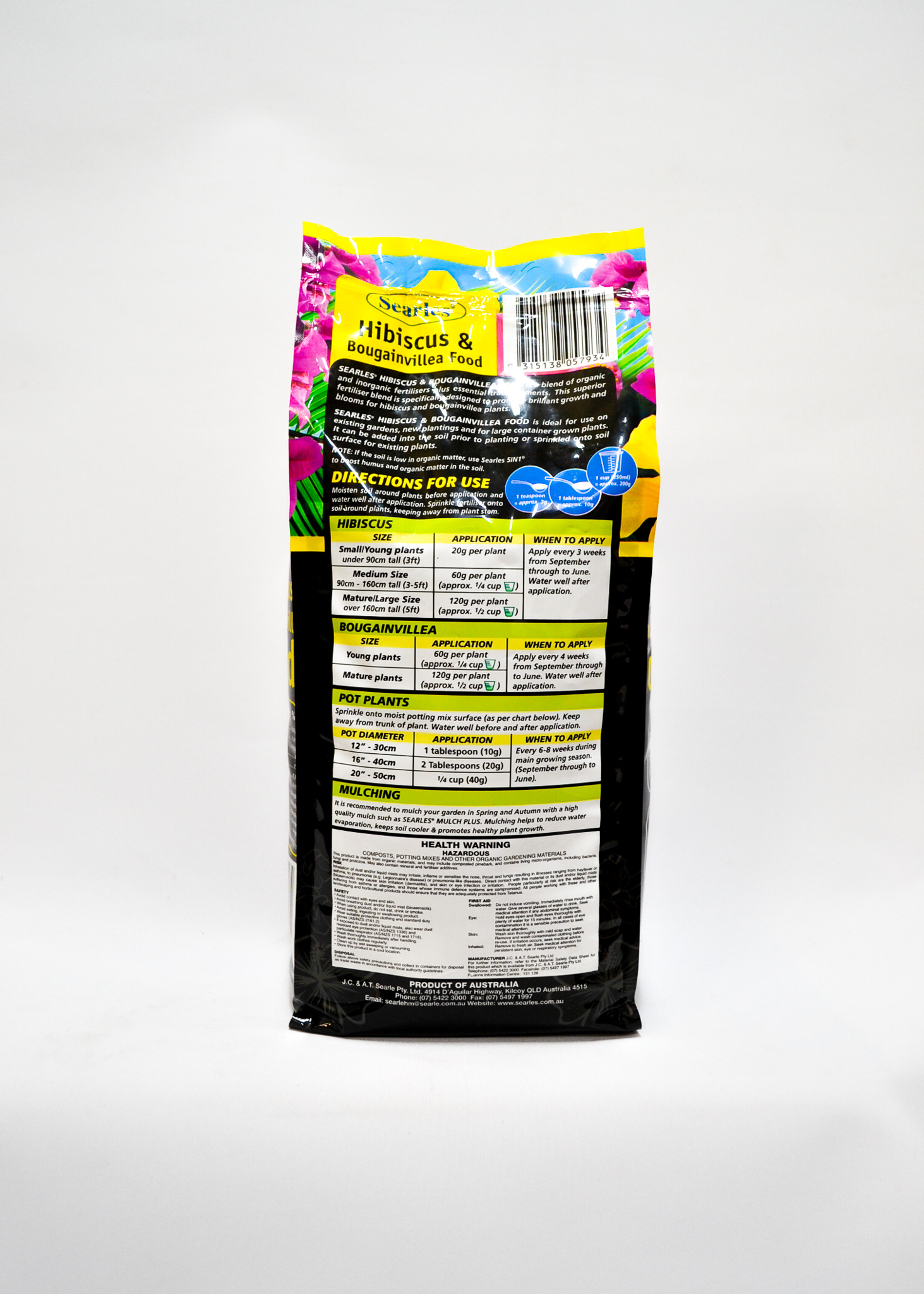 Searles Hibiscus & Bougainvillea Food is a nutritious blend of organic and inorganic fertilisers plus essential trace elements. This superior blend is specifically designed to promote strong healthy plant growth and encourage vibrant blooms on hibiscus and bougainvillea plants.