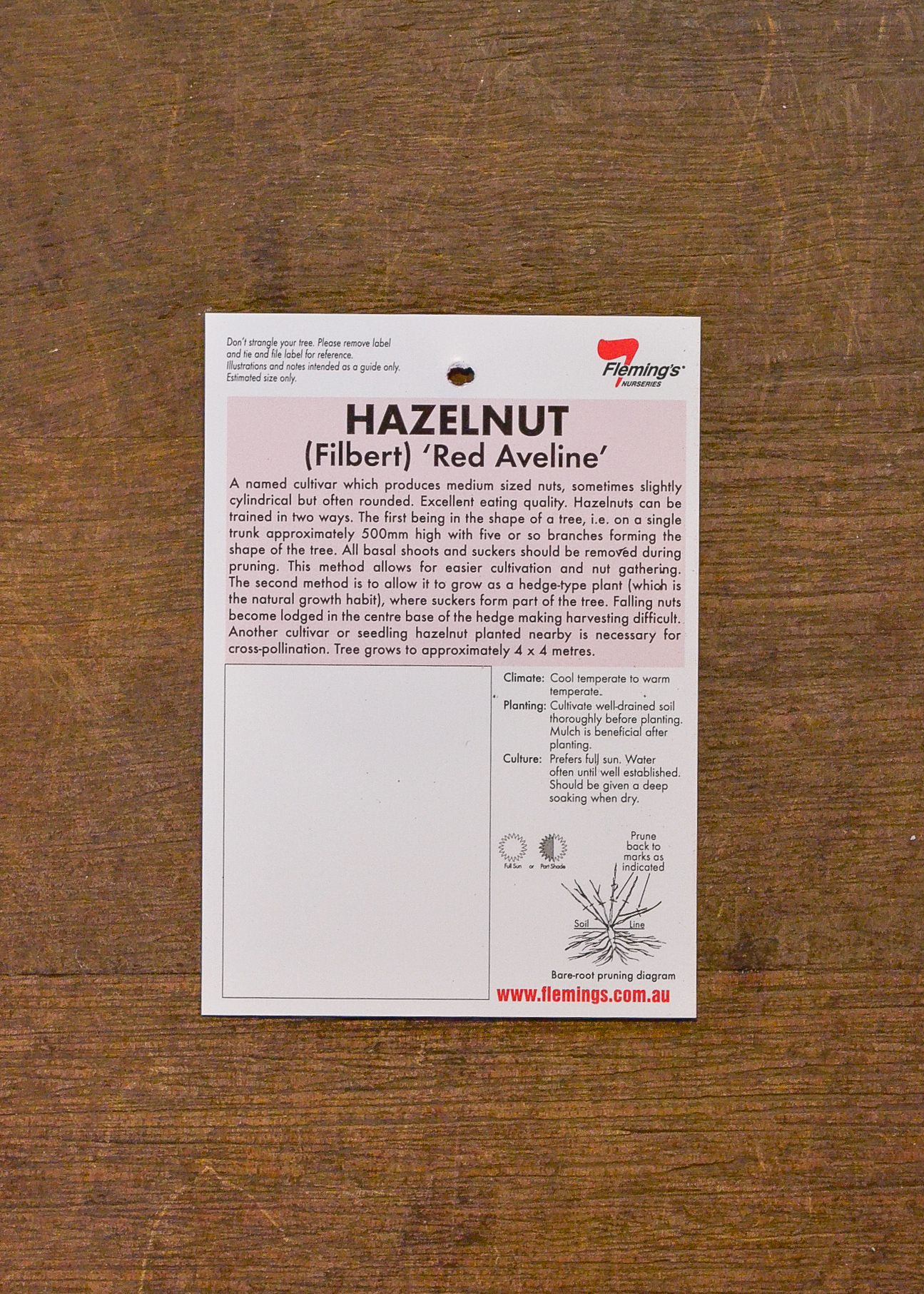 “Red Aveline” produces nuts of excellent eating quality. Hazelnuts are very high in protein and can be roasted, blanched, cooked, or pureed. Prefers temperate climates. Best grown in a sheltered position protected from hot winds and with shade from hot afternoon sun.