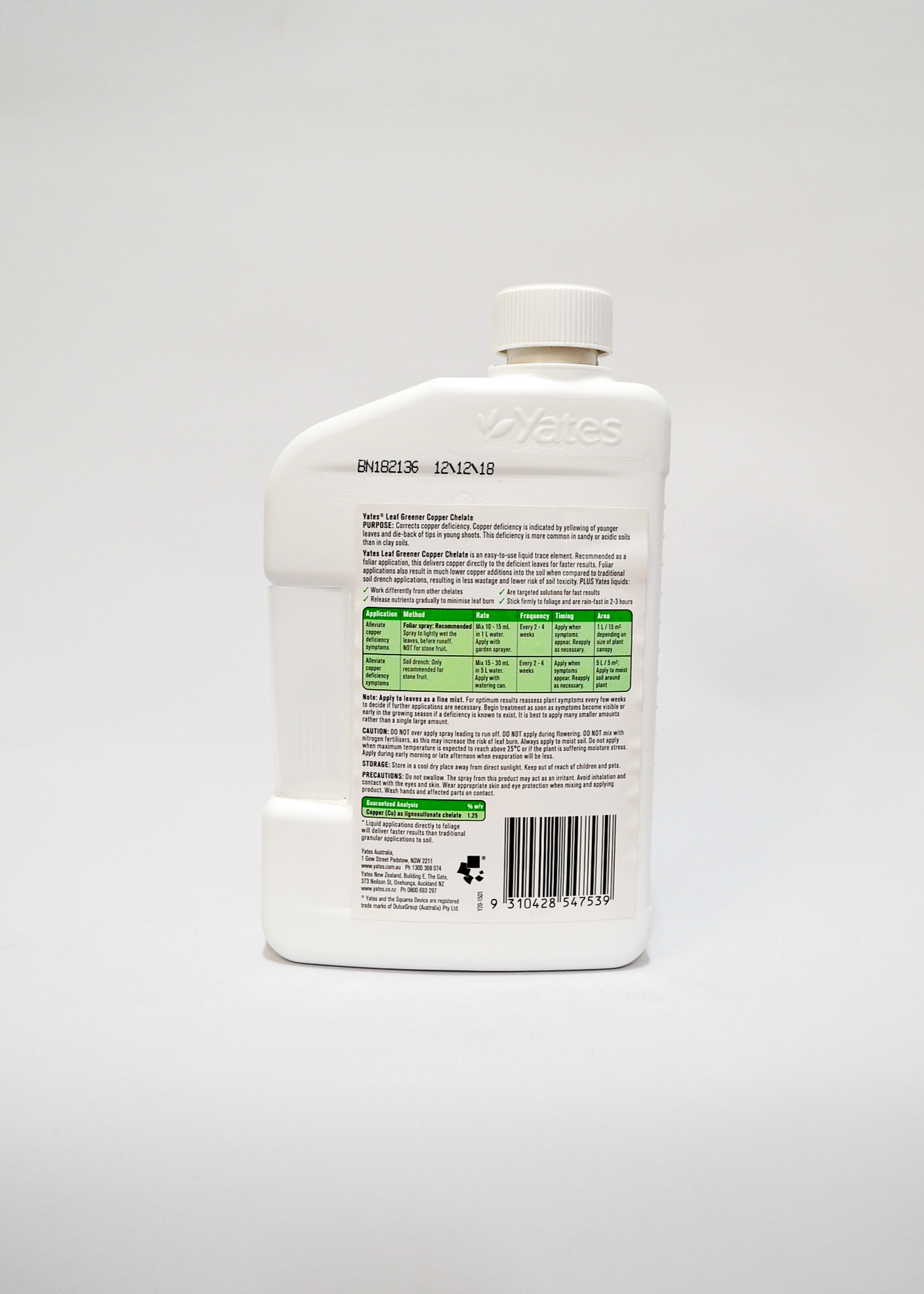 Yates Copper Chelate corrects a copper deficiency more common in sandy and very acidic soils and amongst citrus, vines and vegetables. A copper deficiency is indicated by yellowing of the leaves of younger leaves and die-back of tips in young shoots. The liquid foliar application of copper chelate delivers copper directly to the deficient leaves for faster results.
