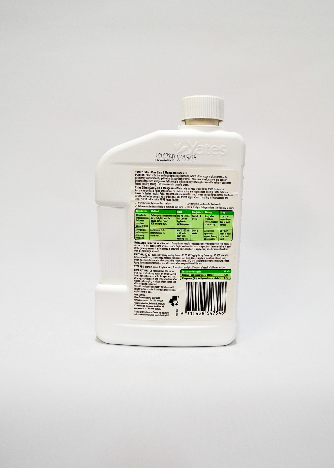 Yates Citrus Cure Zinc and Manganese Chelate is an easy to use liquid trace element mix. Recommended as a foliar application, this delivers zinc and manganese directly to the deficient leaves for faster results. Foliar applications also result in much lower zinc and manganese additions into the soil when compared to traditional soil drench applications, resulting in less wastage and lower risk of soil toxicity.