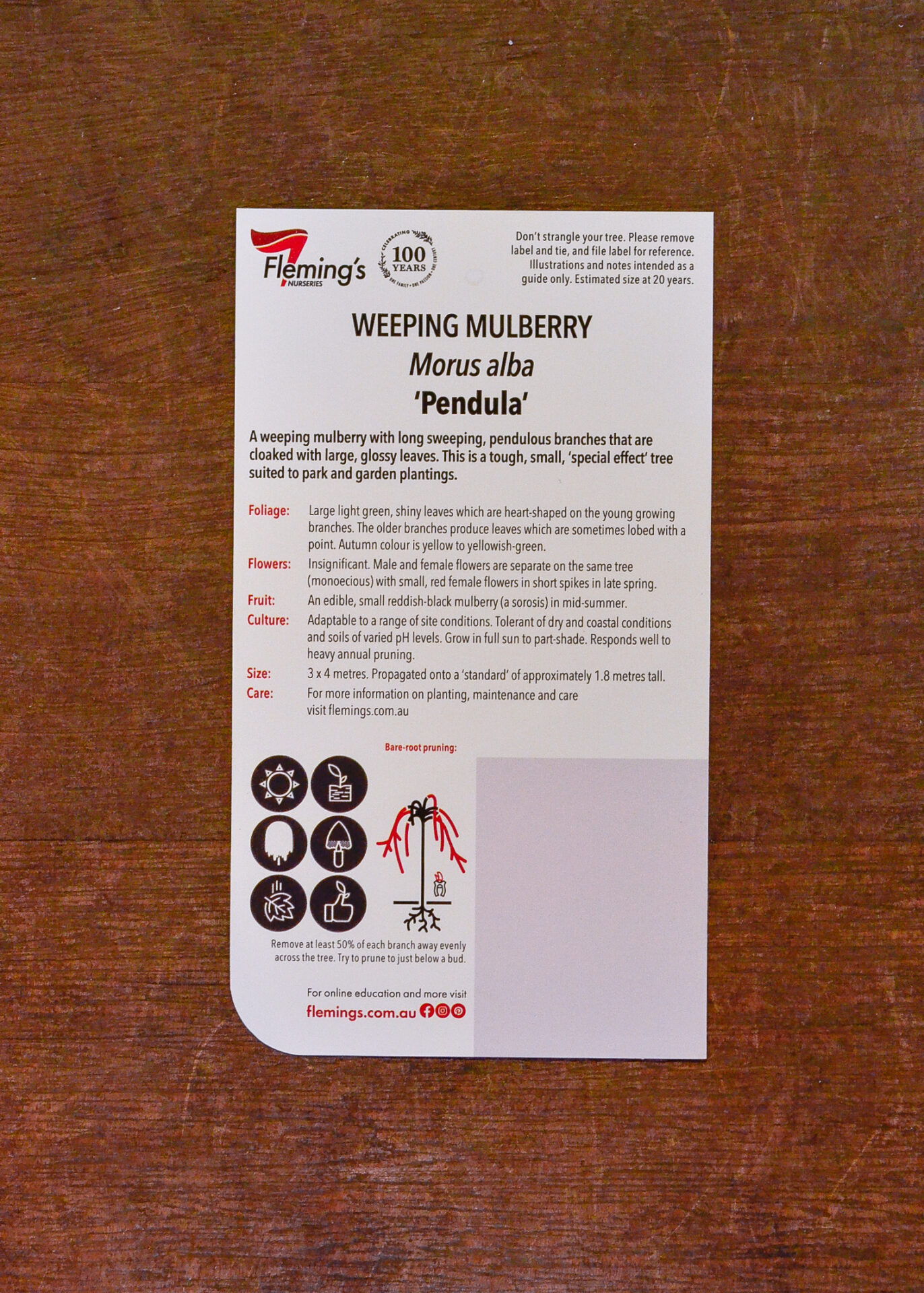 A hardy weeper with long pendulous branches cloaked with large, glossy leaves. Produces small but tasty edible mulberries mid summer. Benefits from annual pruning to establish a good framework of branches. One of the best weeping trees for the Perth area.