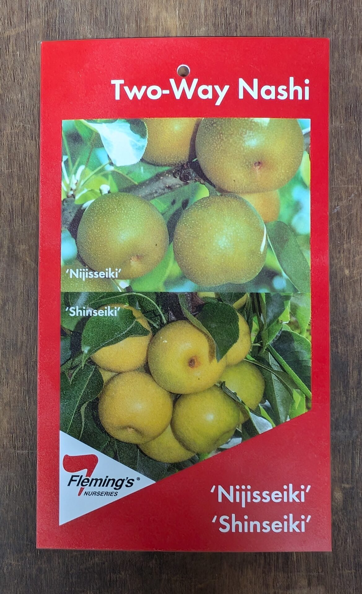 Two popular Nashi varieties grafted onto the same tree. ‘Nijisseiki’ and ‘Shinseiki’ cross-pollinate each other. Fruit ripens from late summer to autumn with ‘Nijisseiki’ fruiting mid-season and ‘Shinseiki’ fruiting early season.