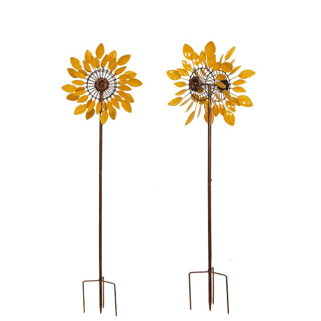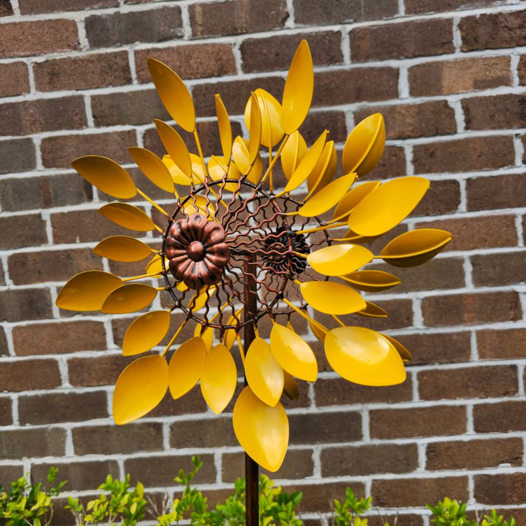 Wind spinner with bright sunny yellow petals. A fun way to add colour and movement to your garden.
