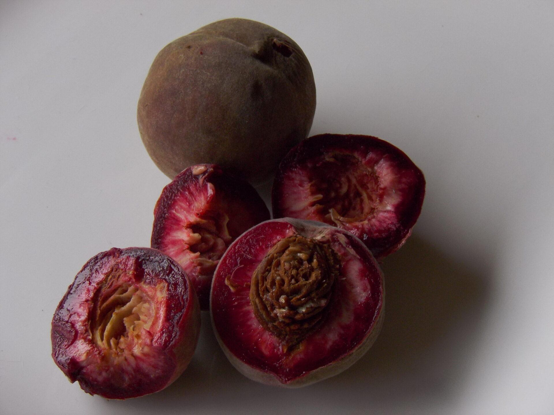 Fruit: Large with deep velvet purple skin, purple and cream, juicy flesh with very good flavour. Freestone