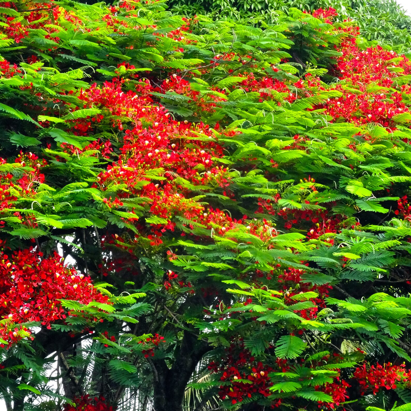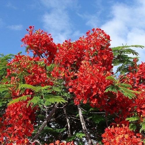 The Poinciana tree is a stunning tropical tree for medium gardens. It has a broad growth habit, putting on more width than height. The semi-deciduous, soft mid-green, fern-like foliage compliments the stunning display of vibrant red flowers. May take several years to produce flowers. Not recommended for frost-prone areas.
