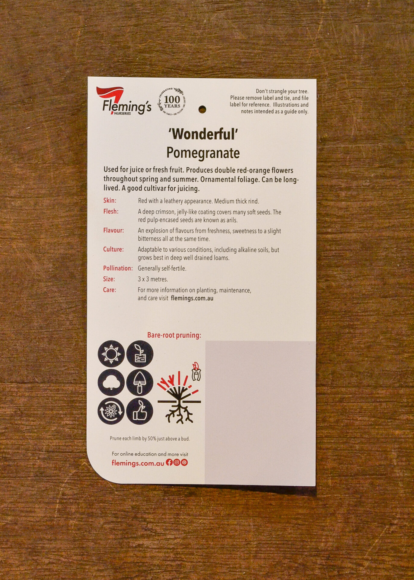 A good cultivar for juicing or fresh fruit. Fruit will ripen over the autumn months. Pomegranates can tolerate drought, but for good fruit production they need summer moisture.